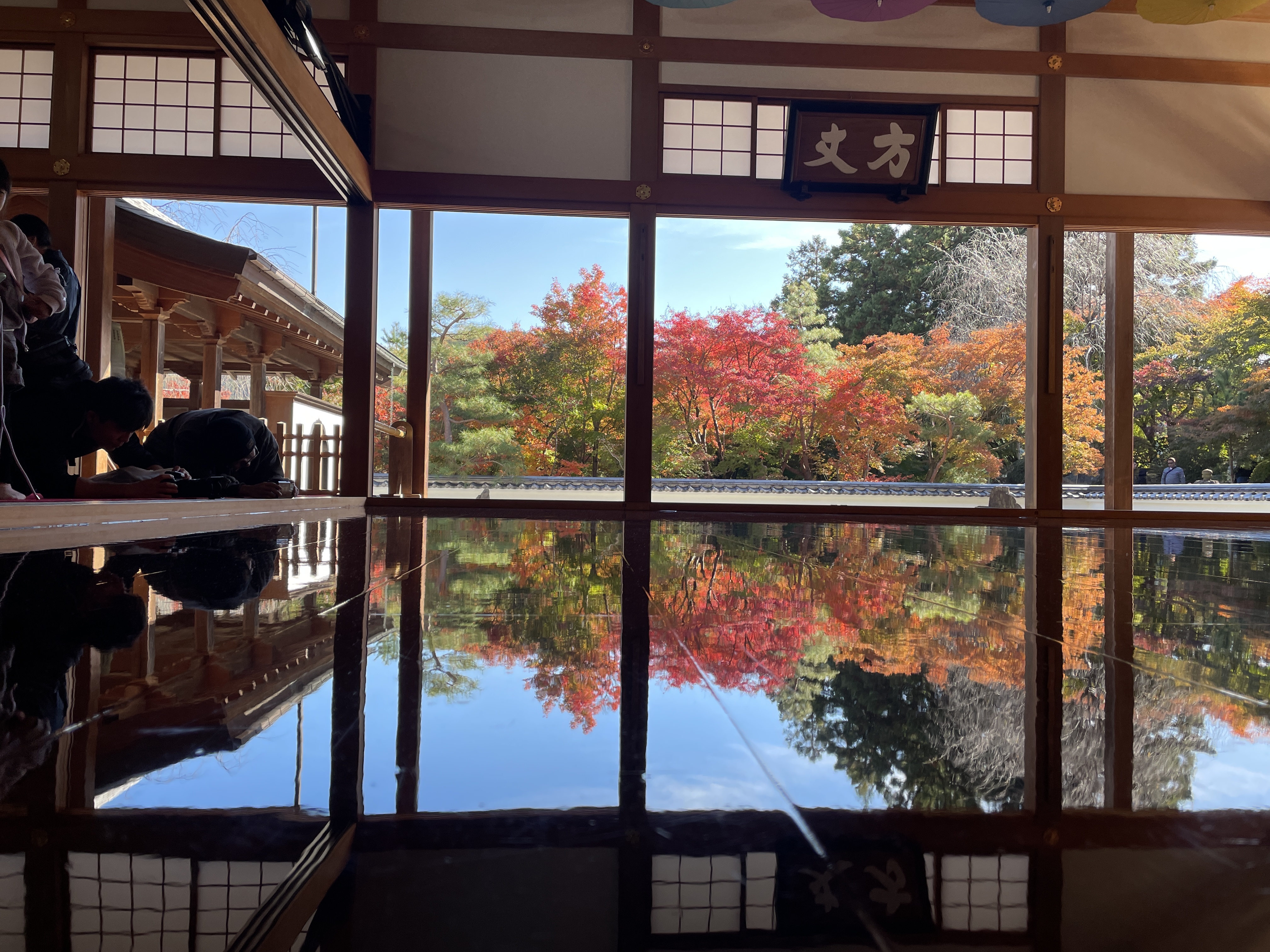 漆で塗られたピカピカの床に映される、真っ赤なもみじ