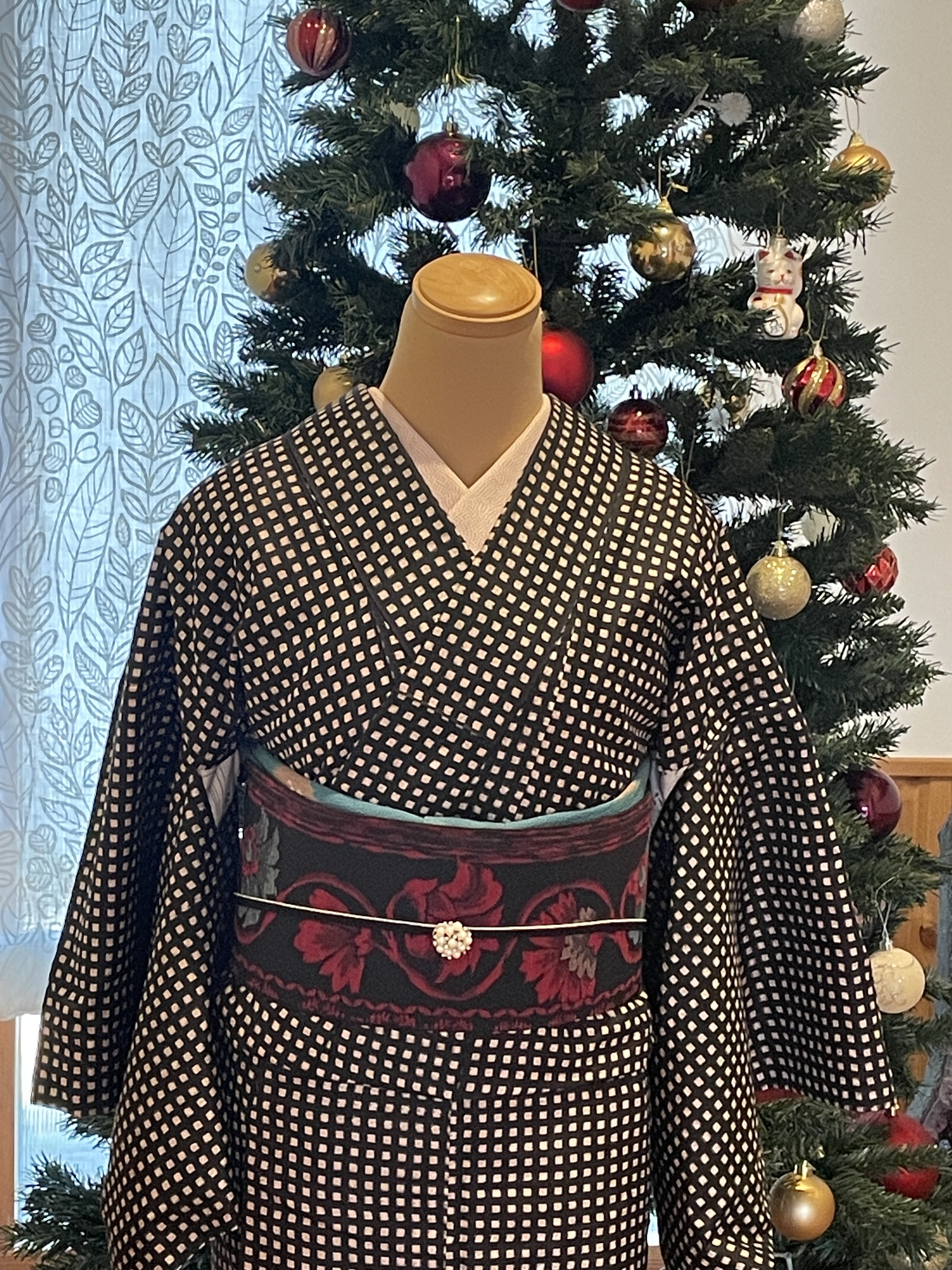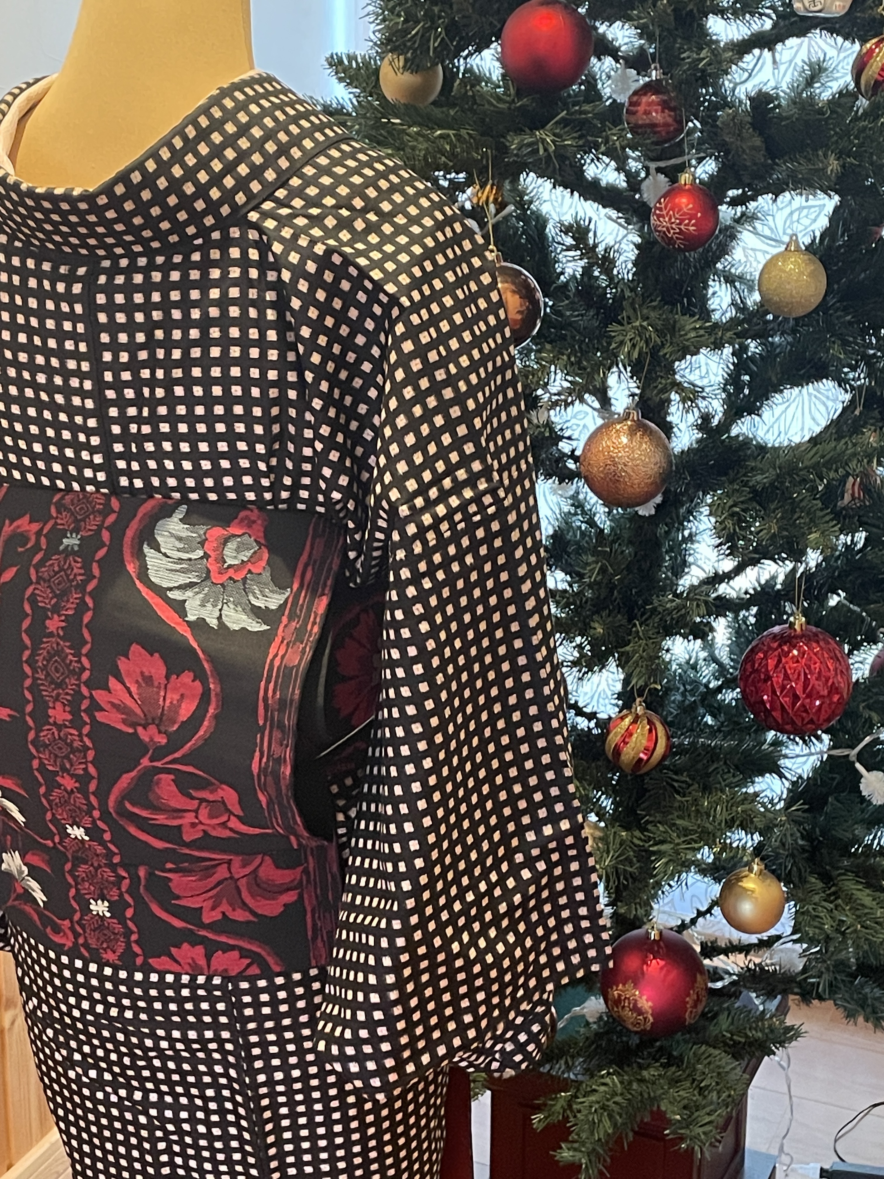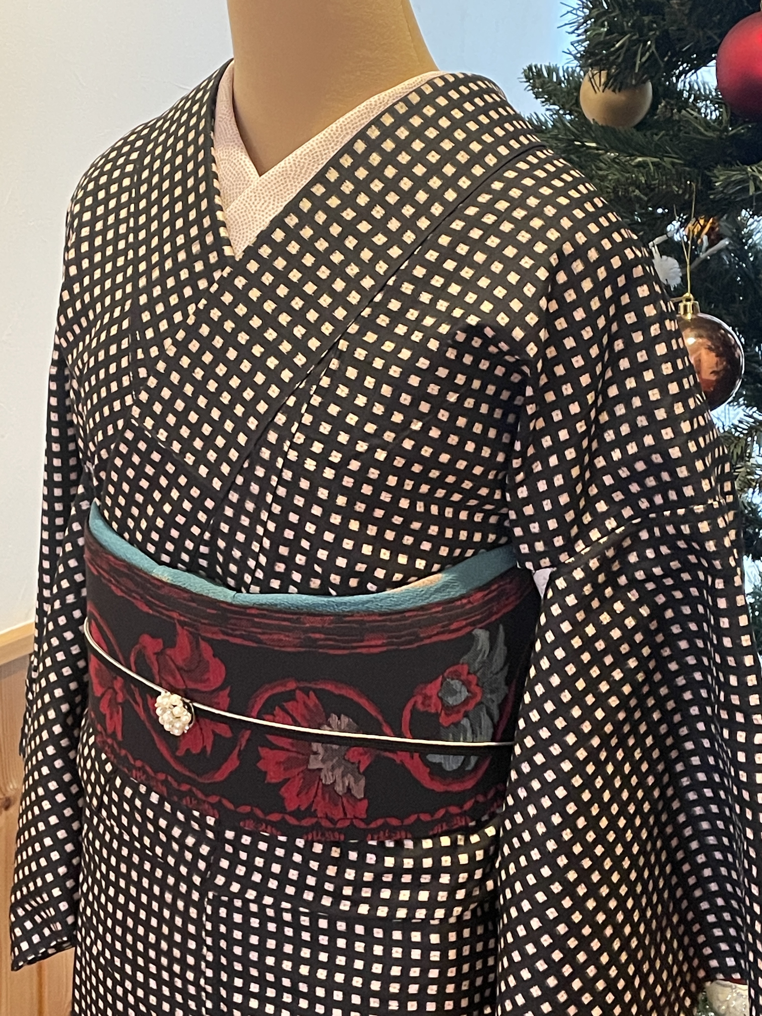 黒字に赤のツタ柄の名古屋帯を合わせて
